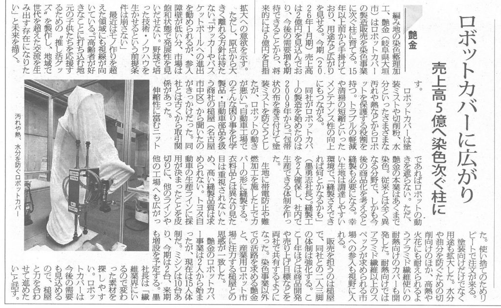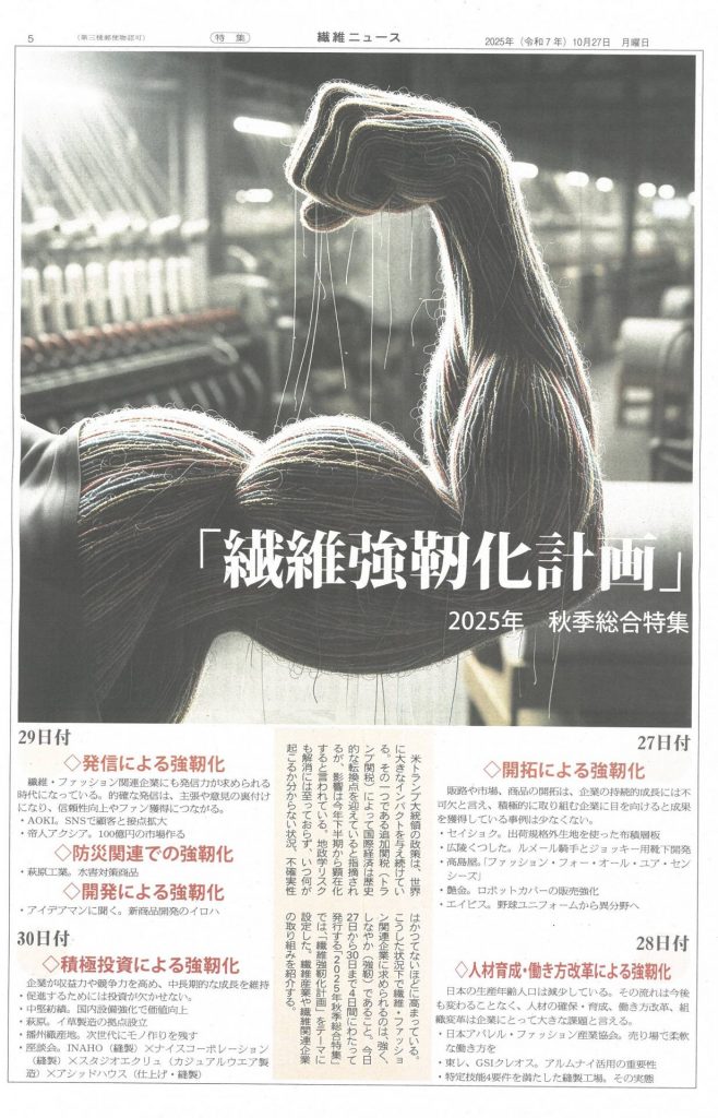 繊維ニュース(2025年10月27日)の、「繊維強靭化計画」特集にて、ロボットカバー製造販売事業について