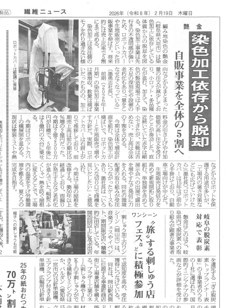 繊維ニュースにて掲載されました。(2026年2月19日)