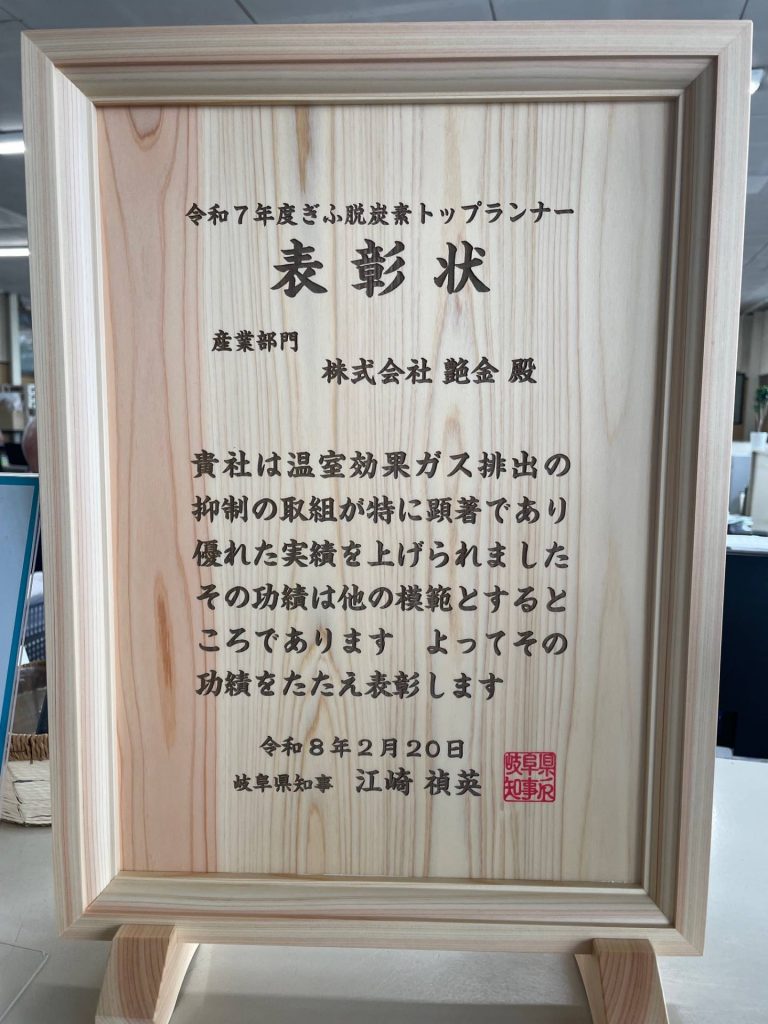 県下にて3社がトップランナーとして選ばれ、岐阜県知事より表彰状を授与していただきました。