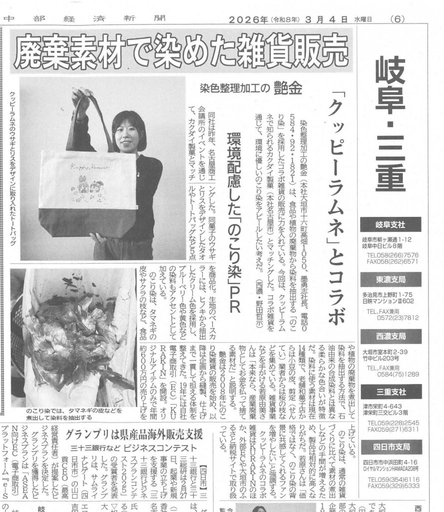 中部経済新聞(2026年3月4日)岐阜・三重版にて、当社オリジナル染色「のこり染」と